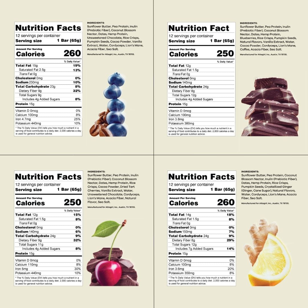 Ingredients: Sunflower Butter, Pea Protein, Inulin (Prebiotic Fiber), Coconut Blossom Nectar, Dates, Hemp Protein, Rice Crisps, Cocoa Powder, Dried Tart Cherries, Vanilla Extract, Water, Unsweetened Chocolate, Cordyceps, Lion’s Mane, Acacia Fiber, Natural Flavor, Sea Salt